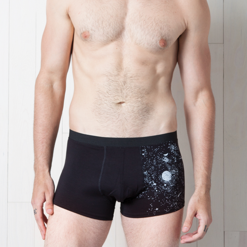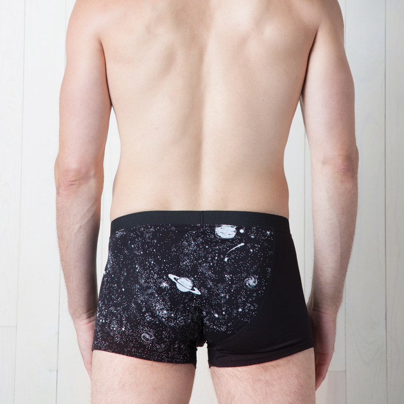 Solar system print hand-drawn by artist Nate Crane on a basic trunk shape. Glow-in-the-dark ink printed on black fabric.