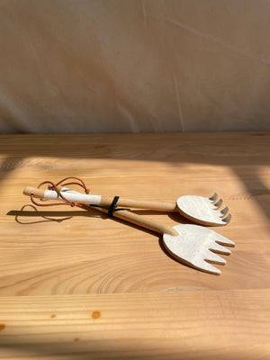 Stoneware serving utensil set. One flat rake and the other with curved teeth to help with a good scooping. Handmade and painted with bright underglaze.
