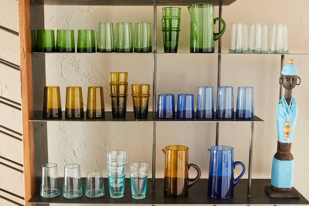 Our Moroccan glassware sets come in four distinct shades of transparent glass (Clear, Amber, Blue & Green). The handblown construction is evident in the bubbles suspended in the glass itself, and the organic forms that the vessels take.